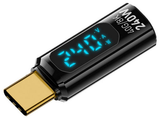 Built-in Smart LED for monitoring the charging state of a connected USB-C device. Plug and play connectivity. Display monitors real-time voltage (V), current (A) and power (W). Supports USB4, 240W USB-PD standard and 8K@60Hz UHD resolution. Supports USB Type-C devices including phone, tablet, laptop, computer and more.