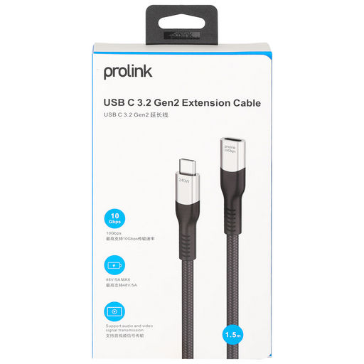 Black | 10Gbps | USB-C TO USB-C socket, 10Gbps data, Supports 240W USB-PD charging, 1.5M | USB Type-C Plug | 1.5M | Prolink | USB Type-C Socket | USB-C;USB-C | USB-C | USB-C | Lead | 5V-48V | 240W |