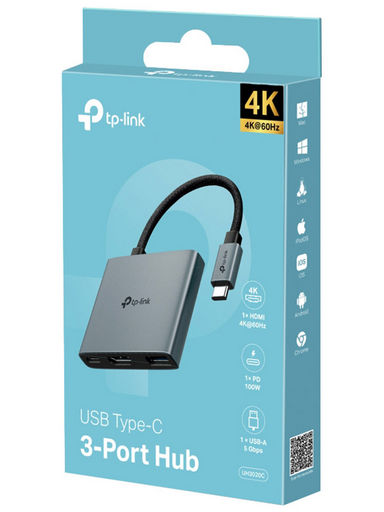 TP-Link UH3020C USB Type-C 3 in 1 Hub USB Type-C 3-Port Hub SPEC: 1 × USB-C Connector,1 × HDMI 4K 60Hz Port,1 × USB-C PD 100W Port,1 × USB-A 3.0 Port FEATURE: Plug and Play, Fast Heat Dissipation, Flexible and Durable