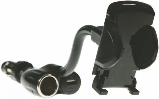 The Aerpro APH350S Accessories Socket Mount Phone Cradle plugs into your vehicle's 12V socket and features a flexible goose-neck arm for adjustable viewing angles. It securely holds devices 45–90mm wide with padded arms and offers 360° rotation. The built-in USB charging port (up to 2A) and passthrough 12V socket allow you to power accessories and charge devices simultaneously.