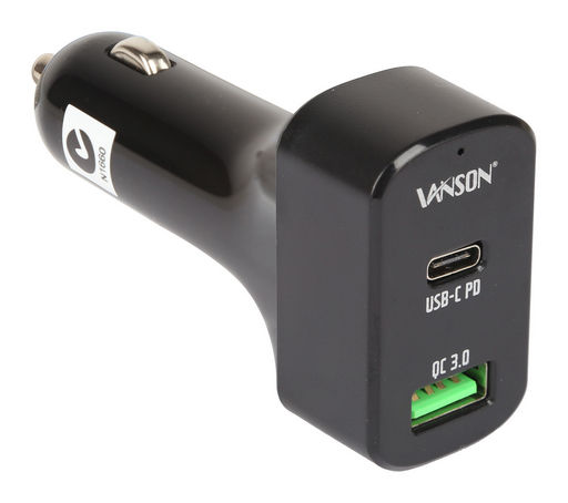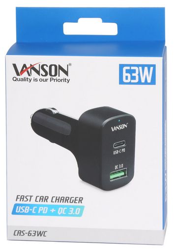 QC3 port: 3A max, USB Type-C port: 3A max | Black | - | 5V 3A max, 9V 2A max and 12V 1.5A max | Single USB with QC 3.0 + USB Type-C with PD | Vanson | CAS-63WC | 1x QC3.0 USB socket + 1x USB Type-C PD socket | Single USB with QC3.0 + USB Type-C with PD | 12-24V | QC3 port: 5V/9A/12V, USB Type-C PD port: 5V/9V/12V/15V/20V |
