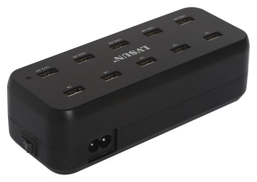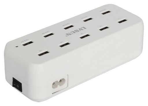 USB charger with 5x fast USB charging ports and 5x regular USB charging ports. Includes AC power lead. Size: 155x60x40mm